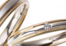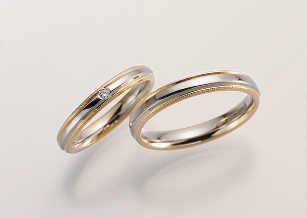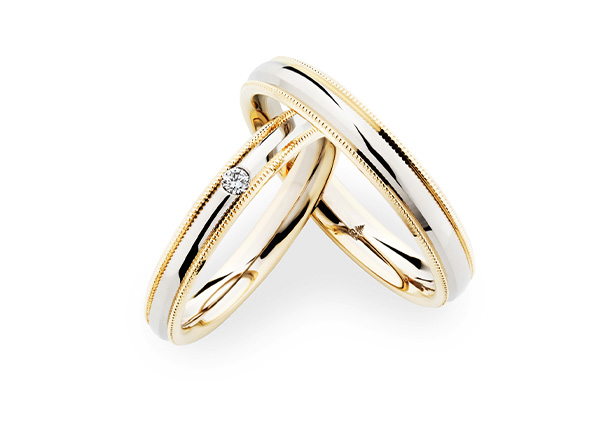 繊細なミルグレインが両サイドに施されたデザインは、ゴールドとホワイトゴールドのコンビネーションが美しく調和しています。