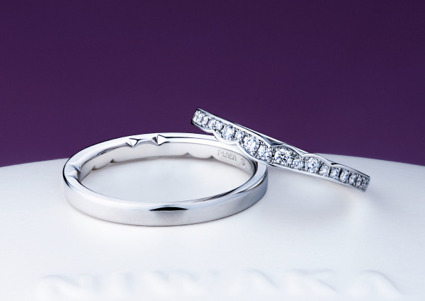 旋律を奏でるように、美しく咲き誇る花をモチーフにデザインした結婚指輪。幸せに満ち、麗かな人生を楽しむ、そんな女性の輝きをダイアモンドの花で表現しています。