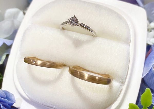 ふたつのマテリアルが溶け合うような結婚指輪の模様は、